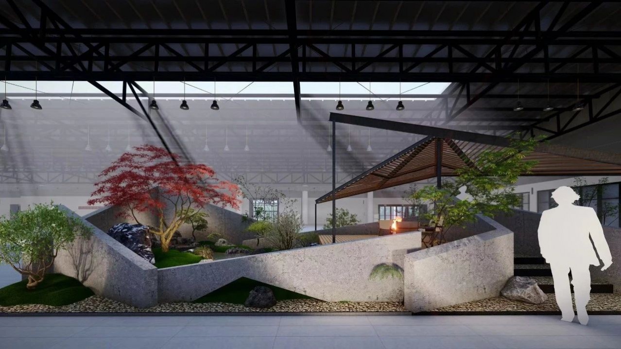 本設計意打造一個反樸還淳的狀態,用最常見的材料打造一個空間、光影、色彩豐富的場景。樹皮代替土壤孕育綠植叢生。砂巖穩若巖石給人安全的踩踏感。水泥板和隔扇屏風給到空間家一樣的圍合感。體驗其中,夯土墻的通道跨越時代的轉換,老布料的門簾想起媽媽的味道。