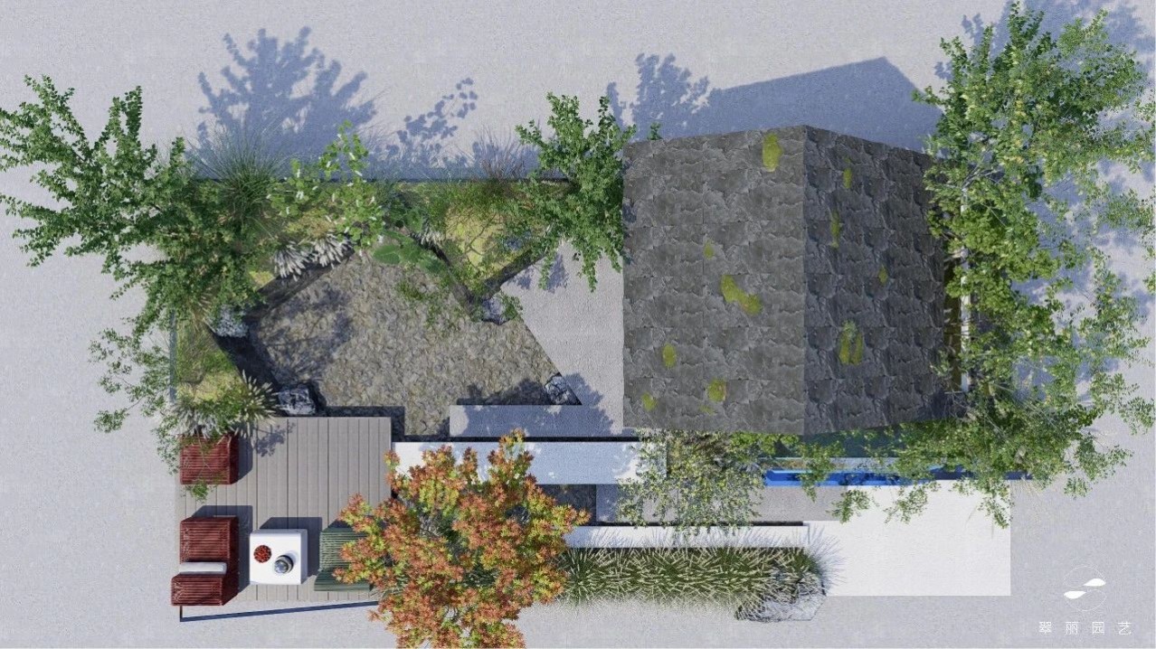以四川自然溪流為樣板,首先在出水口上以山泉流出,然后宛然曲折流入小池塘中。水系周邊以自然山溪為藍本自然景石和苔蘚植物收邊,自然散置的小喬木點綴其中。