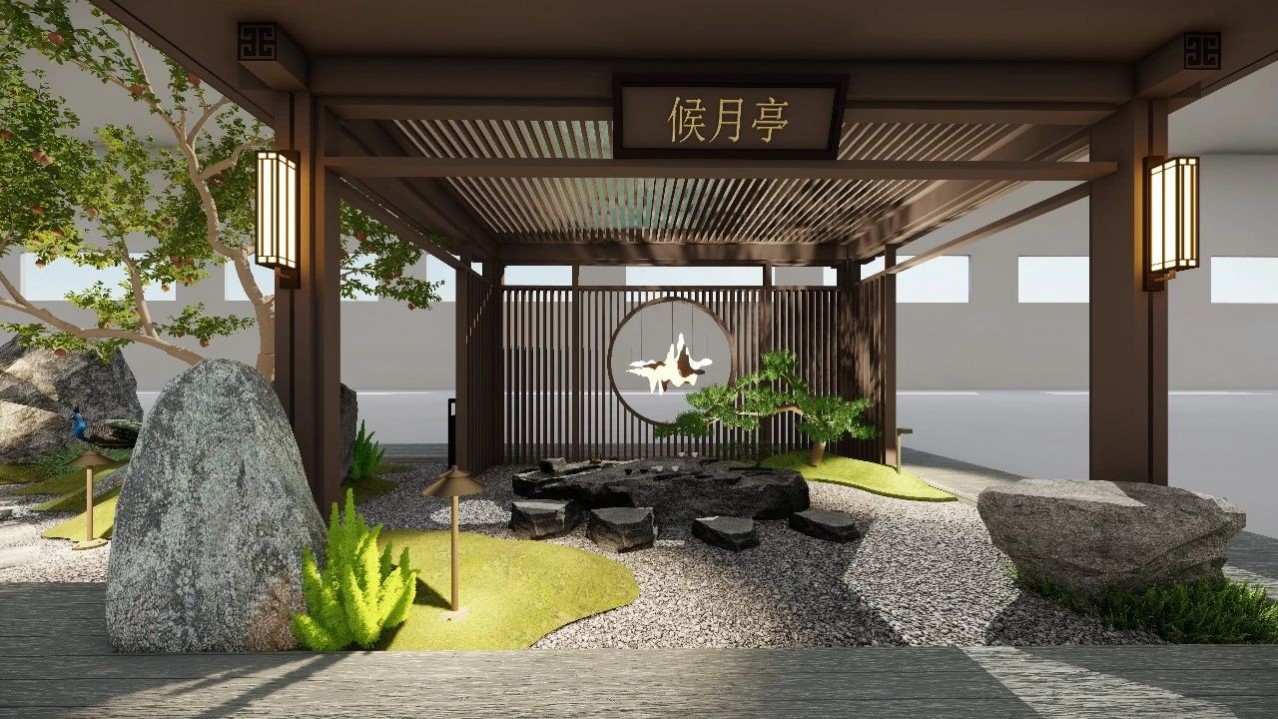 設計蜀園的時候,里面沒有用到設計師常用的進口植物,川派工藝臥龍式的雀舌羅漢松作為了原石茶臺后的背景,有臥龍護園的比喻,也是主人位的靠山,石榴樹是源于川西高原的古樁石榴經過長年的風磨,古樸蒼勁碩果累累代表秋收冬藏,也常用于庭院中的鎮宅樹東榴金,寓意多子多福,前置的大葉黃楊球象征著圓滿。
