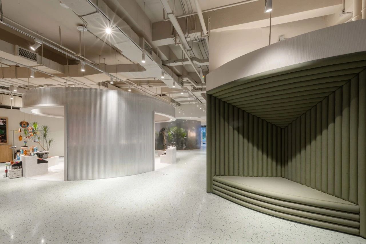 青山從濕地的線條和包裹式的形態中汲取靈感,塑造出整體空間形態。整個空間用曲線包裹功能空間,形成多個“功能泡泡”。通過不同材料和形態的運用,賦予每個空間獨特的特性,暗合濕地的空間特點;柔和曲折的動線讓參觀者宛若漫步濕地,還原了一種移步異景的探索之感。