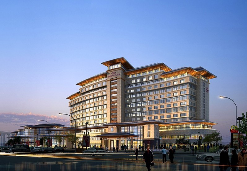 項(xiàng)目位于江蘇省揚(yáng)州市,北臨文昌大橋,西臨京杭大運(yùn)河,南臨湖濱規(guī)劃道路,東靠京杭路,是揚(yáng)州廣陵新城“京杭之心”規(guī)劃區(qū)域內(nèi)重要的建筑。揚(yáng)州市東部,北臨文昌大橋,西臨京杭大運(yùn)河,南臨大湖,東靠京杭路。項(xiàng)目利用基地內(nèi)的多種自然條件和景觀優(yōu)勢,平面布置呈東西走向,沿南側(cè)水體弧線舒展布局,使景觀價(jià)值在每間客房得到充分的體現(xiàn),按照廣陵新城的規(guī)劃設(shè)計(jì)理念,建筑與湖心形成向心關(guān)系,體現(xiàn)出完整的的濱水空間,創(chuàng)造豐富的親水體驗(yàn)。建筑立面風(fēng)格,端莊氣派,立面設(shè)計(jì)成三段式的處理,建筑底部為石材面飾,彰顯氣派厚重感;中間為虛實(shí)對比的分層條窗,頂部為簡約的坡屋頂,整體建筑極具現(xiàn)代感又不失對地域文化的詮釋。